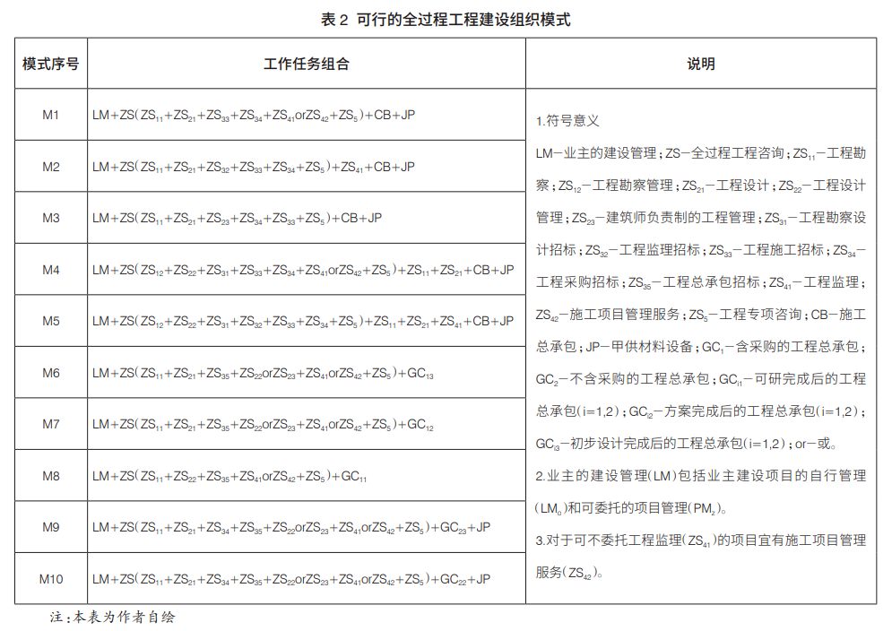 國家鼓勵(lì)多種形式的全過程工程咨詢服務(wù)模式,服務(wù)內(nèi)容可以是跨階段組合或同一階段內(nèi)不同類型的組合。據(jù)筆者調(diào)查,目前業(yè)界認(rèn)可度較高的全過程工程咨詢內(nèi)容主要包括勘察設(shè)計(jì)、招標(biāo)采購、監(jiān)理與施工項(xiàng)目管理服務(wù)以及工程專項(xiàng)咨詢。其中,工程勘察設(shè)計(jì)咨詢分為工程勘察設(shè)計(jì)和勘察設(shè)計(jì)管理服務(wù)兩種類型;工程專項(xiàng)咨詢包括項(xiàng)目融資、工程造價(jià)、信息技術(shù)等業(yè)主所需求的咨詢服務(wù)?;谶@一認(rèn)識,筆者梳理了建設(shè)、勘察設(shè)計(jì)、監(jiān)理、施工等單位在工程建設(shè)中的關(guān)系組合,并列出工程建設(shè)全過程主要的建設(shè)組織模式,如表2所示。