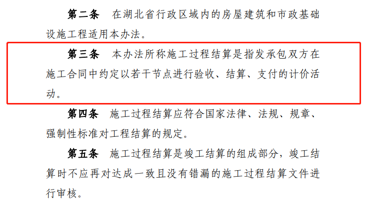本條定義何為施工過程結(jié)算,相較住建部2021年發(fā)布的《建筑工程施工發(fā)包與承包計(jì)價(jià)管理辦法》(修訂征求意見稿)第十九條規(guī)定“全面推行施工過程結(jié)算和支付。發(fā)承包雙方通過合同約定,按時(shí)間節(jié)點(diǎn)或進(jìn)度節(jié)點(diǎn)對周期內(nèi)已完成且無爭議的工程量進(jìn)行價(jià)款計(jì)算、確認(rèn),并按照合同約定比例支付?!?span style=";margin: 0px; padding: 0px; outline: 0px; max-width: 100%;Helvetica Neue", "PingFang SC", "Hiragino Sans GB", "Microsoft YaHei UI", "Microsoft YaHei", Arial, sans-serif; text-align: justify; background-color: rgb(248, 248, 248); box-sizing: border-box !important; overflow-wrap: break-word !important;">《暫行辦法》增加了節(jié)點(diǎn)驗(yàn)收,驗(yàn)收是節(jié)點(diǎn)結(jié)算與支付的前提。