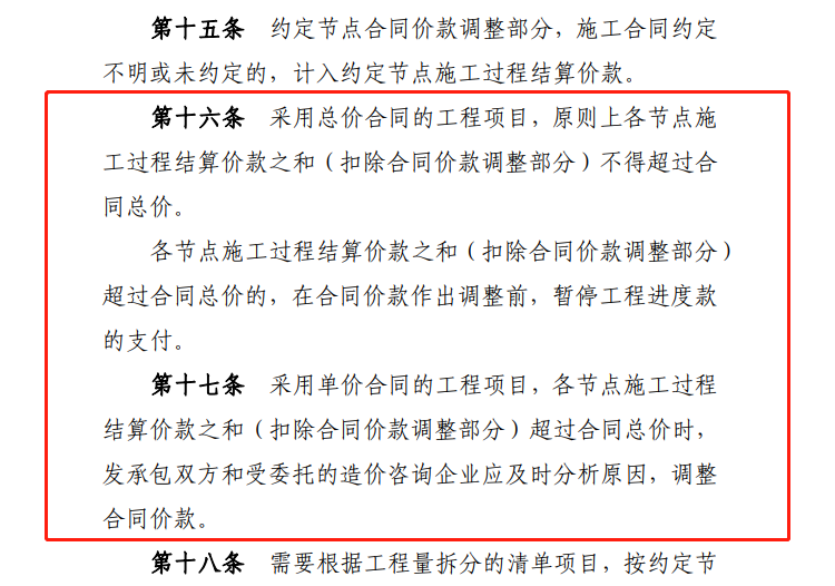 分別對總價(jià)合同的建設(shè)項(xiàng)目和單價(jià)合同的建設(shè)項(xiàng)目的施工過程結(jié)算的方式和過程進(jìn)行解釋、說明??偠灾还芸們r(jià)合同還是單價(jià)合同,施工過程結(jié)算價(jià)款之和(扣除合同價(jià)款調(diào)整部分)均不得超過合同總價(jià),否則可能出現(xiàn)工程未完成已支付完成的情況。具體支付比例可根據(jù)發(fā)包人資金使用計(jì)劃在合同中約定,但不得低于當(dāng)?shù)匦姓鞴懿块T的相關(guān)規(guī)定。