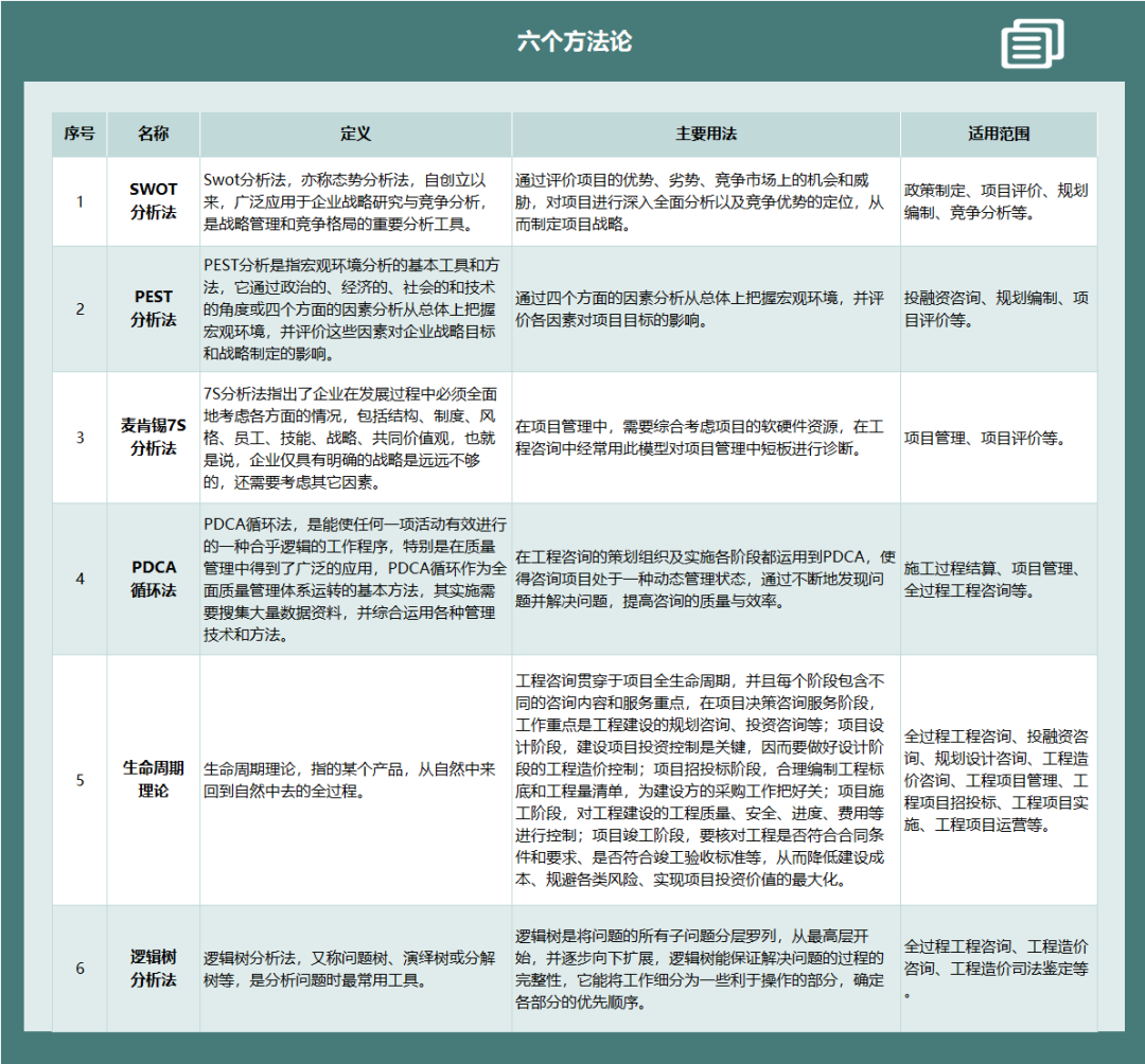 在理念更新迭代以后,行動必須緊緊跟上。王志綱老師曾說:“我手中掌握的超級法寶,就是方法論。只有掌握了正確的方法論,才能做到海納百川,消化一切?!?因此,作為一家工程咨詢服務(wù)機(jī)構(gòu),工作方法論便是幫助我們更好地診斷、研判、分析、實操項目的獨門秘方。