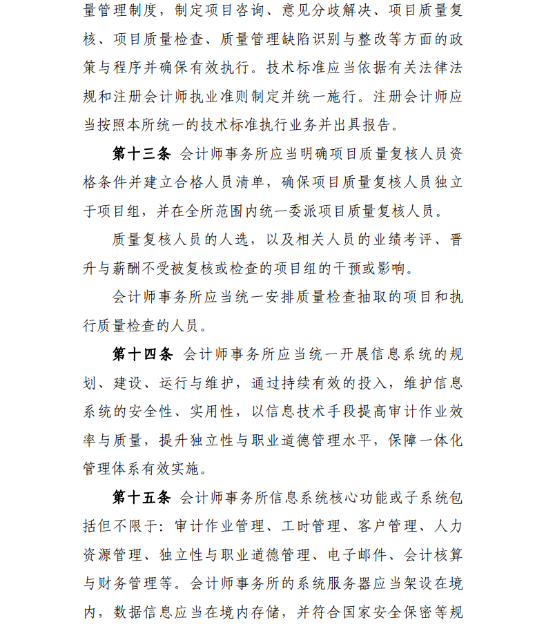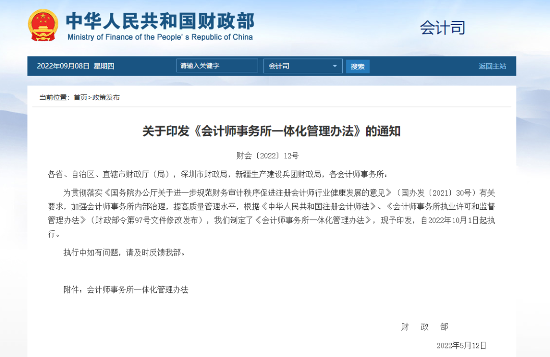 為貫徹落實(shí)《國(guó)務(wù)院辦公廳關(guān)于進(jìn)一步規(guī)范財(cái)務(wù)審計(jì)秩序促進(jìn)注冊(cè)會(huì)計(jì)師行業(yè)健康發(fā)展的意見》(國(guó)辦發(fā)〔2021〕30號(hào))有關(guān)要求,加強(qiáng)會(huì)計(jì)師事務(wù)所內(nèi)部治理,提高質(zhì)量管理水平,根據(jù)《中華人民共和國(guó)注冊(cè)會(huì)計(jì)師法》、《會(huì)計(jì)師事務(wù)所執(zhí)業(yè)許可和監(jiān)督管理辦法》(財(cái)政部令第97號(hào)文件修改發(fā)布),我們制定了《會(huì)計(jì)師事務(wù)所一體化管理辦法》,現(xiàn)予印發(fā),自2022年10月1日起執(zhí)行。