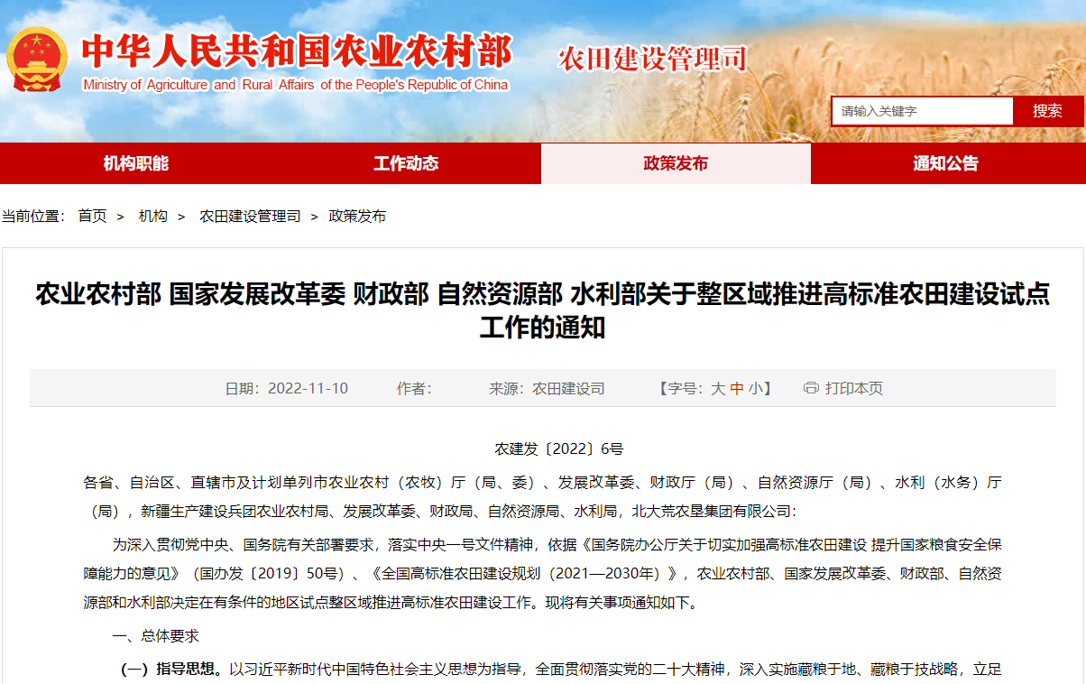 為深入貫徹黨中央、國務(wù)院有關(guān)部署要求,落實(shí)中央一號文件精神,依據(jù)《國務(wù)院辦公廳關(guān)于切實(shí)加強(qiáng)高標(biāo)準(zhǔn)農(nóng)田建設(shè) 提升國家糧食安全保障能力的意見》(國辦發(fā)〔2019〕50號)、《全國高標(biāo)準(zhǔn)農(nóng)田建設(shè)規(guī)劃(2021—2030年)》,農(nóng)業(yè)農(nóng)村部、國家發(fā)展改革委、財(cái)政部、自然資源部和水利部決定在有條件的地區(qū)試點(diǎn)整區(qū)域推進(jìn)高標(biāo)準(zhǔn)農(nóng)田建設(shè)工作?,F(xiàn)將有關(guān)事項(xiàng)通知如下。