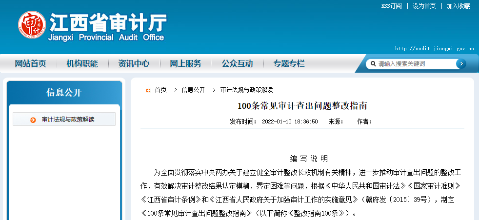 為進一步推動審計查出問題整改工作,加強對審計整改結(jié)果認(rèn)定的指導(dǎo),江西省審計廳印發(fā)了《100條常見審計查出問題整改指南》(以下簡稱《整改指南100條》)?!墩闹改?00條》按照常見的重大政策措施落實、預(yù)算管理、政府采購及招投標(biāo)、基本建設(shè)、內(nèi)控管理、企業(yè)管理、自然資源、社保資金及安居工程、金融管理、國外貸援款共10類審計內(nèi)容進行問題分類,列舉了100個常見問題并給出相對應(yīng)的整改方法說明,供審計機關(guān)和整改責(zé)任單位在審計整改工作中參照落實。整改特色亮點一是突出落實被審計單位整改主體責(zé)任;二是突出健全完善長效機制;三是突出問題分類整改。
