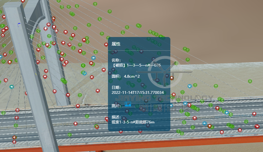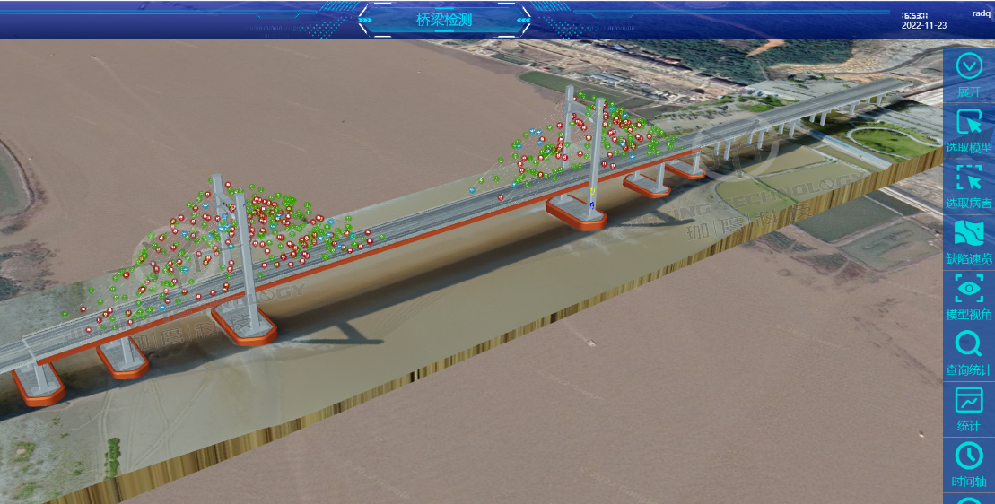 根據(jù)拍攝的高清圖像重建橋梁三維模型,并定量標(biāo)示各類(lèi)缺陷的位置,并且搭建獨(dú)立的大數(shù)據(jù)云平臺(tái),實(shí)現(xiàn)橋梁缺陷與病害的可視化,對(duì)橋梁?jiǎn)栴}進(jìn)行三維立體化復(fù)現(xiàn),為橋梁安全運(yùn)行提供數(shù)據(jù)支撐。
