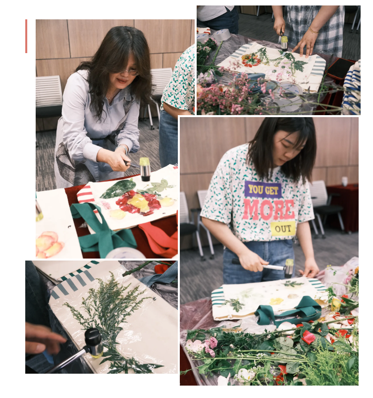 活動現(xiàn)場充滿了歡聲笑語,大家紛紛使出“洪荒之力”,咚咚咚…….伴隨著細碎的敲擊聲和花草香,一幅幅色彩斑斕的植物圖案躍然紙上。