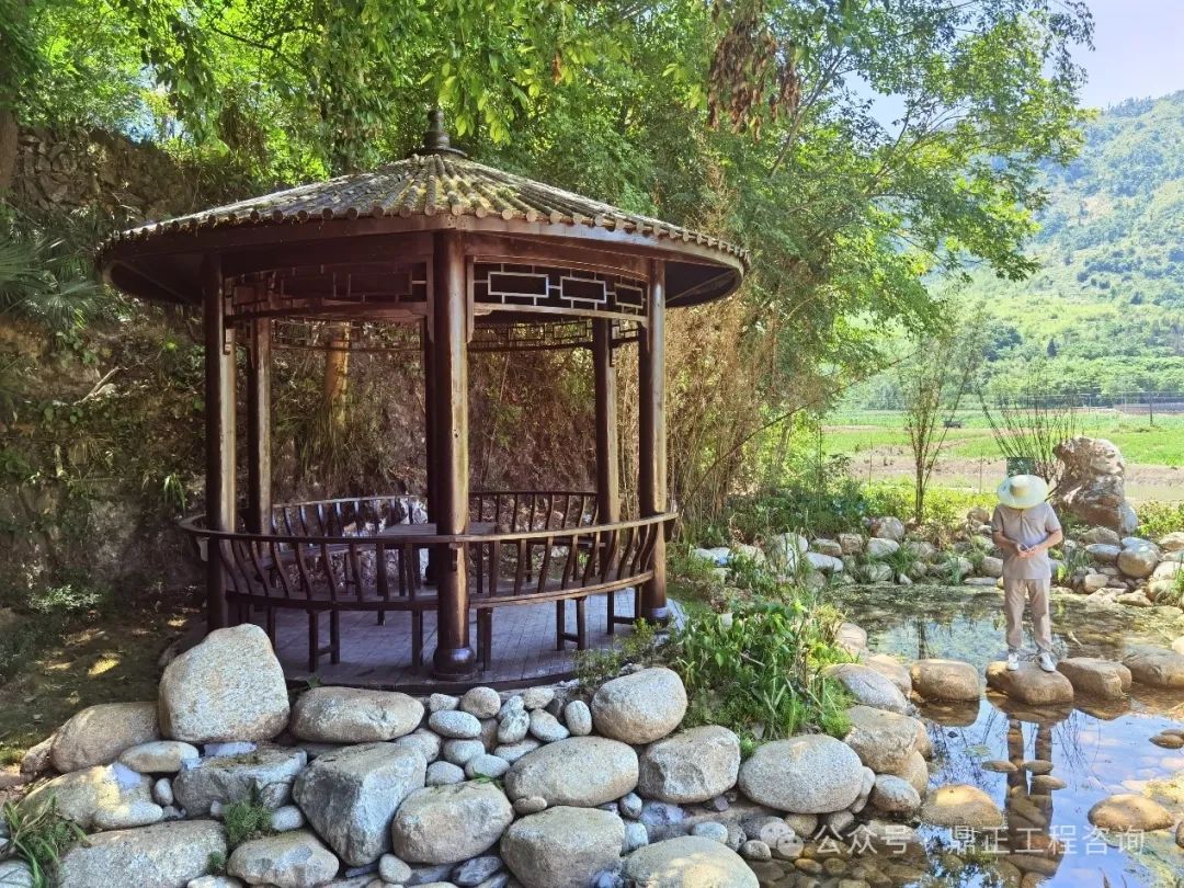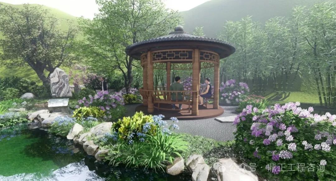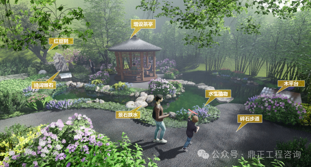 水景觀水文化打造:通過深挖相公泉?dú)v史文化內(nèi)涵,進(jìn)行本地印象提煉?!跋喙币辉~在古代,是妻子對(duì)丈夫的稱呼,也是君子、生員(秀才、相公)、宰相的另一種叫法。君子愛茶,沏茶品茗,修煉品性,以茶可雅志,茶是象征著塵世的純潔。設(shè)計(jì)從自然山水出發(fā),落位于閑情逸致設(shè)計(jì)基調(diào),泉眼處采用題字景石配上一棵姿態(tài)旖旎的紅豆,視線端頭一幅竹影錦鯉、花木跌水的畫面映入眼簾,兩側(cè)的樹木林立,開合有致,整個(gè)節(jié)點(diǎn)的中心是一座圓頂茶亭,在亭中,一壺清茶問道,仿佛拉近了古今往事,也增加了場地的記憶,呈現(xiàn)出 “千年古樹頻招手,萬年清泉溢清香”的意境。