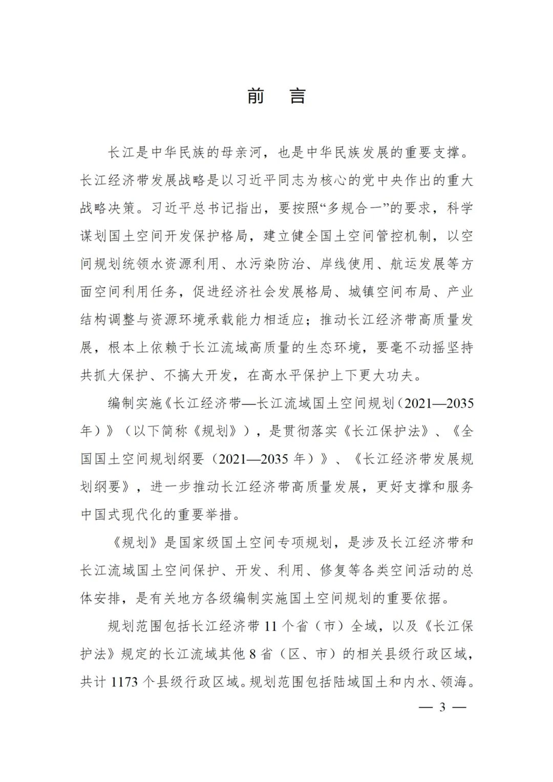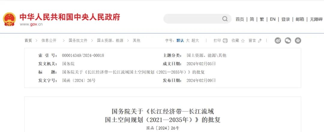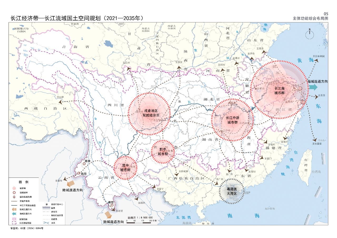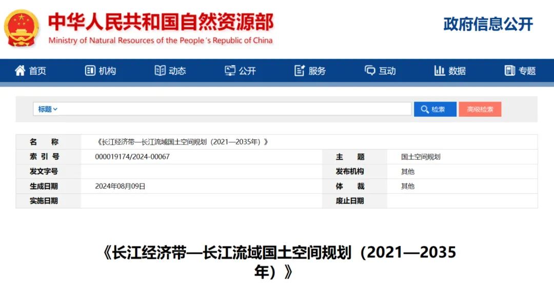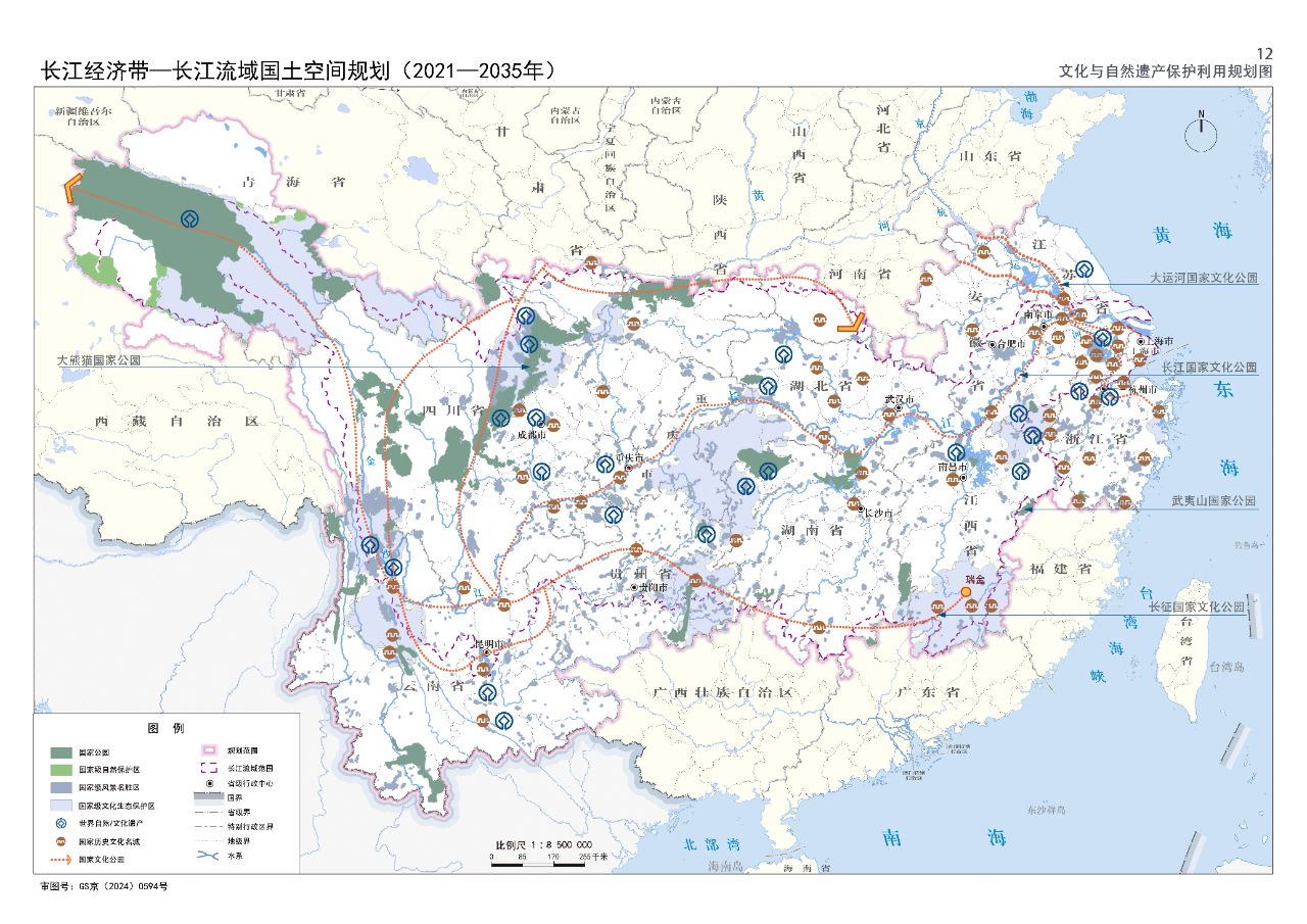 2024年2月9日,《長(zhǎng)江經(jīng)濟(jì)帶—長(zhǎng)江流域國(guó)土空間規(guī)劃(2021—2035年)》經(jīng)國(guó)務(wù)院批復(fù)同意。9月10日,自然資源部正式印發(fā)《長(zhǎng)江經(jīng)濟(jì)帶—長(zhǎng)江流域國(guó)土空間規(guī)劃(2021—2035年)》。規(guī)劃范圍包括長(zhǎng)江經(jīng)濟(jì)帶11個(gè)?。ㄊ校┤?/strong>,以及《長(zhǎng)江保護(hù)法》規(guī)定的長(zhǎng)江流域其他8?。▍^(qū)、市)的相關(guān)縣級(jí)行政區(qū)域,共計(jì)1173個(gè)縣級(jí)行政區(qū)域。規(guī)劃范圍包括陸域國(guó)土和內(nèi)水、領(lǐng)海。其中,陸域面積240萬平方公里。(后附規(guī)劃范圍詳細(xì)表格)規(guī)劃期限為2021年至2035年。