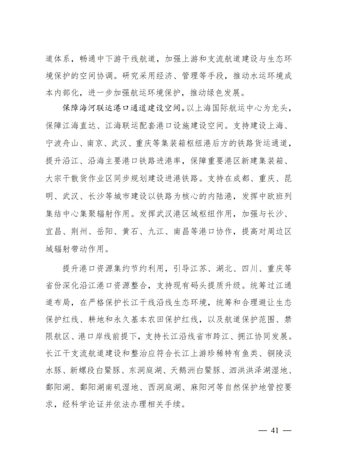 以上海國(guó)際航運(yùn)中心為龍頭,保障江海直達(dá)、江海聯(lián)運(yùn)配套港口設(shè)施建設(shè)空間。支持建設(shè)上海、寧波舟山、南京、武漢、重慶等集裝箱樞紐港后方的鐵路貨運(yùn)通道,提升沿江、沿海主要港口鐵路進(jìn)港率,保障重要港區(qū)新建集裝箱、大宗干散貨作業(yè)區(qū)同步規(guī)劃建設(shè)進(jìn)港鐵路。