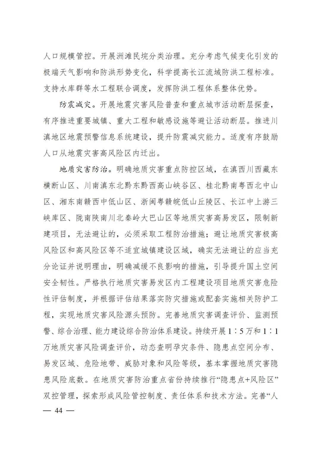 地質(zhì)災(zāi)害防治 明確地質(zhì)災(zāi)害重點(diǎn)防控區(qū)域,在滇西川西藏東橫斷山區(qū)、川南滇東北黔東黔西高山峽谷區(qū)、桂北黔南粵西北中山區(qū)、湘東南贛西中低山區(qū)、浙閩粵贛皖低山丘陵區(qū)、長(zhǎng)江中上游三峽庫(kù)區(qū)、隴南陜南川北秦嶺大巴山區(qū)等地質(zhì)災(zāi)害高易發(fā)區(qū),限制新建項(xiàng)目,無法避讓的,必須采取工程防治措施;避讓地質(zhì)災(zāi)害極高風(fēng)險(xiǎn)區(qū)和高風(fēng)險(xiǎn)區(qū)等不適宜城鎮(zhèn)建設(shè)區(qū)域,確實(shí)無法避讓的應(yīng)當(dāng)充分論證并說明理由,明確減緩不良影響的措施,引導(dǎo)提升國(guó)土空間安全韌性。