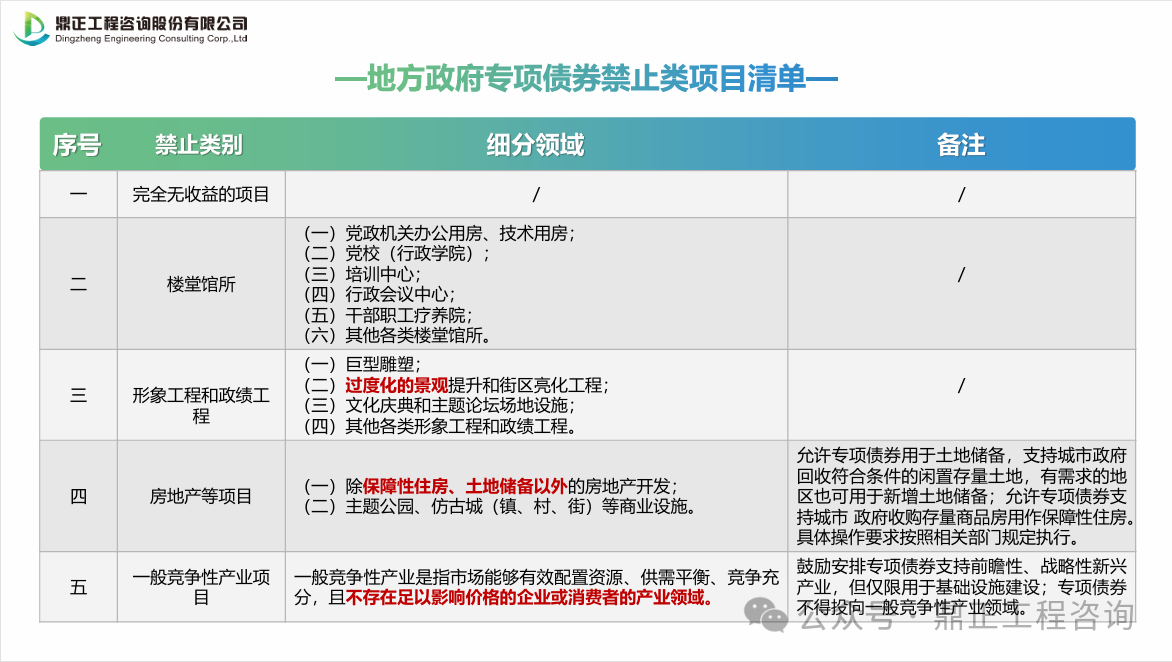 按照52號文要求,項目實行專項債券投向領(lǐng)域“負(fù)面清單”管理,未納入“負(fù)面清單”的項目均可申請專項債券資金。專項債券依法不得用于經(jīng)常性支出,嚴(yán)禁用于發(fā)放工資、養(yǎng)老金 及支付單位運行經(jīng)費、債務(wù)利息等。在專項債券用作項目資本金范圍方面實行“正面清單”管理,擴(kuò)大專項債券用作項目資本金范圍。