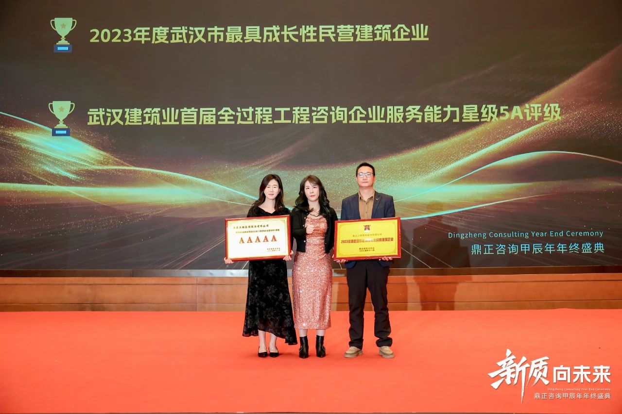 在過(guò)去的一年里,鼎正在專(zhuān)家輔助人、專(zhuān)項(xiàng)債、超長(zhǎng)期特別國(guó)債、中央預(yù)算內(nèi)資金、全過(guò)程工程咨詢(xún)等業(yè)務(wù)板塊中,展現(xiàn)出強(qiáng)勁的創(chuàng)新力,并獲得行業(yè)廣泛的認(rèn)可。當(dāng)晚,武漢建筑業(yè)協(xié)會(huì)領(lǐng)導(dǎo)代表、全咨分會(huì)秘書(shū)長(zhǎng)陳金琳女士,為我們頒發(fā)了2023年度武漢市最具成長(zhǎng)性民營(yíng)建筑企業(yè)、武漢建筑業(yè)首屆全過(guò)程工程咨詢(xún)企業(yè)服務(wù)能力星級(jí)5A評(píng)級(jí)兩項(xiàng)榮譽(yù)。
