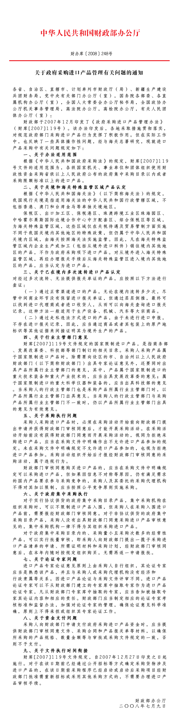 關(guān)于政府采購進(jìn)口產(chǎn)品管理有關(guān)問題的通知(財(cái)辦庫〔2008〕248號)