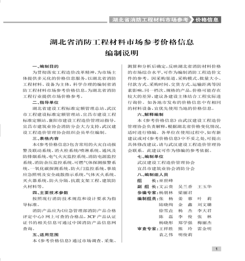武漢建設(shè)工程造價管理協(xié)會、宜昌市建筑業(yè)協(xié)會消防分會聯(lián)合組建了編委會,通過市場調(diào)查、數(shù)據(jù)分析、整理歸類、專家審查等環(huán)節(jié),保證了價格信息的科學性、合理性、準確性、完整性。